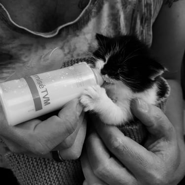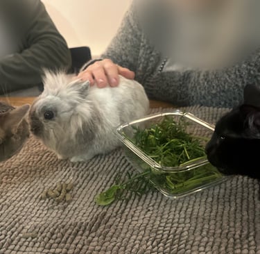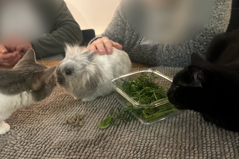 Ils ne sont pas les seuls animaux de la maison. Vittel, notre chatte trouvée à deux semaines et recueillie alors qu’elle n’était pas sevrée, a grandi avec nous. Nous l’avons nourrie, accompagnée et aidée à devenir autonome. Elle est très attachée aux humains, mais son histoire particulière ne lui permet pas de participer aux séances de médiation animale.